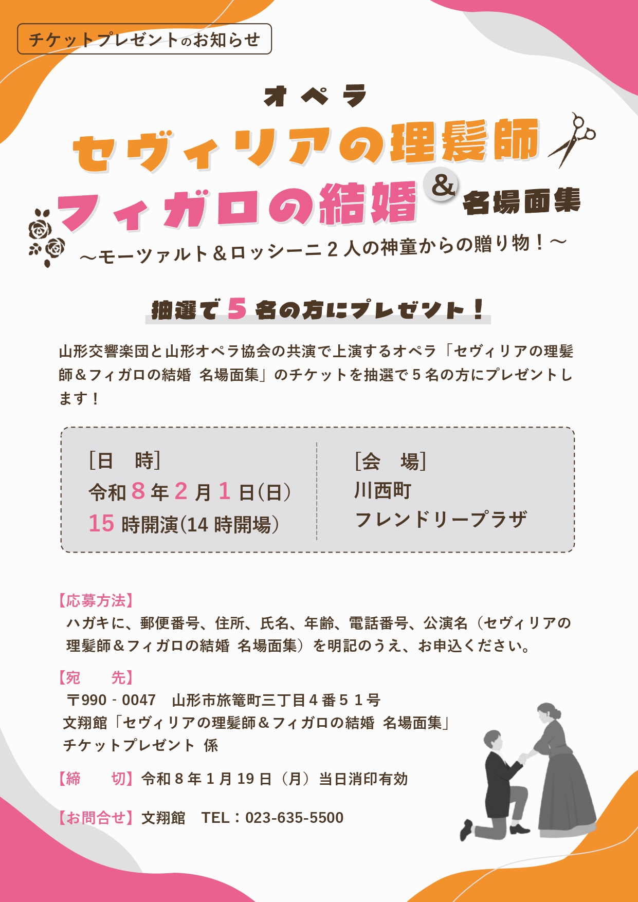 | 内容 | 2月1日(日)開催のオペラ『セヴィリアの理髪師&フィガロの結婚 名場面集』公演に、抽選で5名様をご招待いたします! 華やかなオペラの世界をぜひこの機会に楽しんでみませんか? 皆様のご応募をお待ちしております! 応募締切:1月19日(月)当日消印有効 応募方法:ハガキに郵便番号、住所、氏名、年齢、電話番号、公演名(セヴィリアの理髪師&フィガロの結婚 名場面集)を明記のうえ、以下宛先までご応募ください。 ーーー 〒990-0047山形市旅篭町三丁目4番51号 文翔館「セヴィリアの理髪師&フィガロの結婚 名場面集」チケットプレゼント係 ーーー |