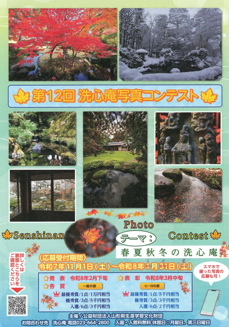 | 内容 | 平素より当財団の事業について、ご理解とご協力を賜り厚くお礼申し上げます。 洗心庵写真コンテストの応募締め切り日ですが、令和8年1月31日(土)から、令和8年2月6日(金)(必着)に延長します。 寒い日が続いておりますが、皆さまのご応募お待ちしています。 |
