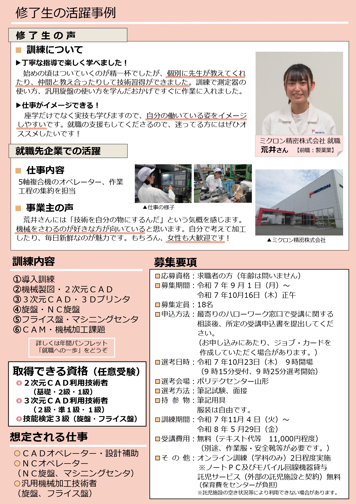 ポリテクセンター山形 11月受講生募集中! CAD・NCものづくり科