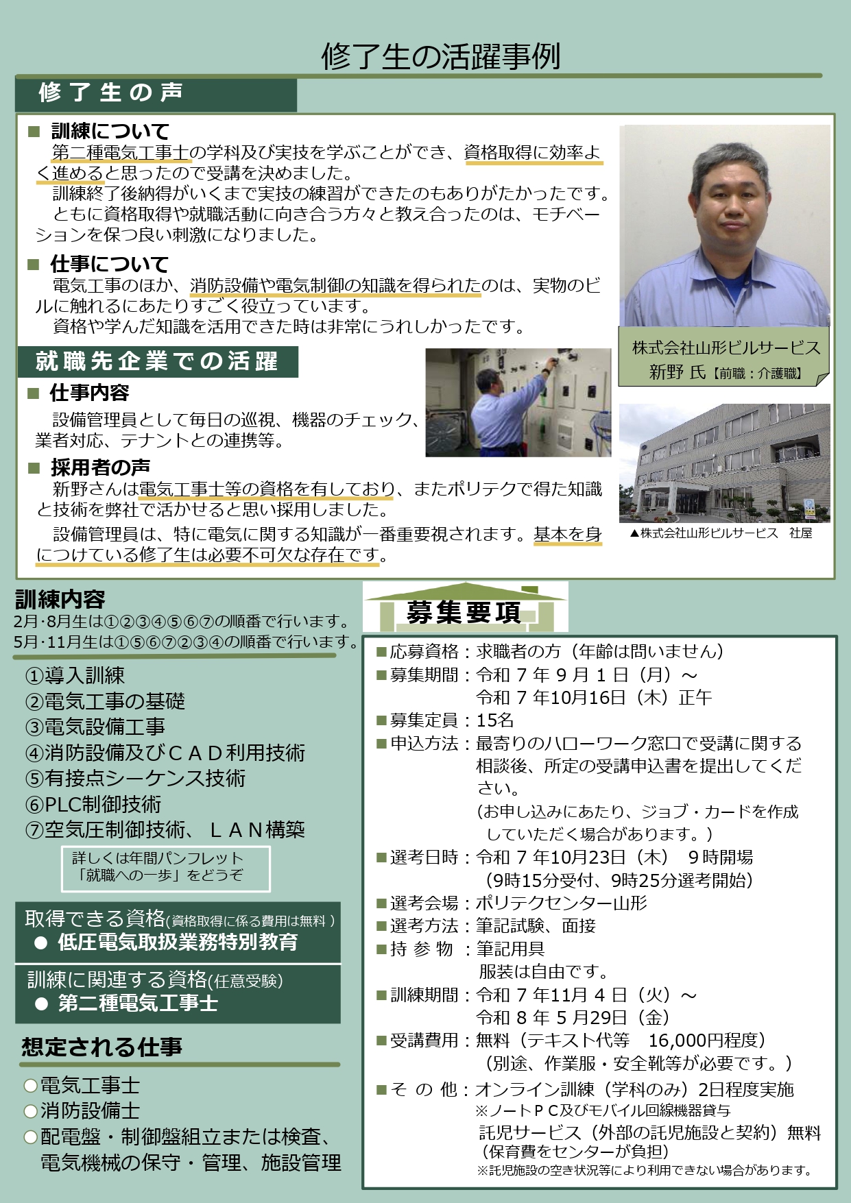 ポリテクセンター山形 11月受講生募集中! 電気設備技術科