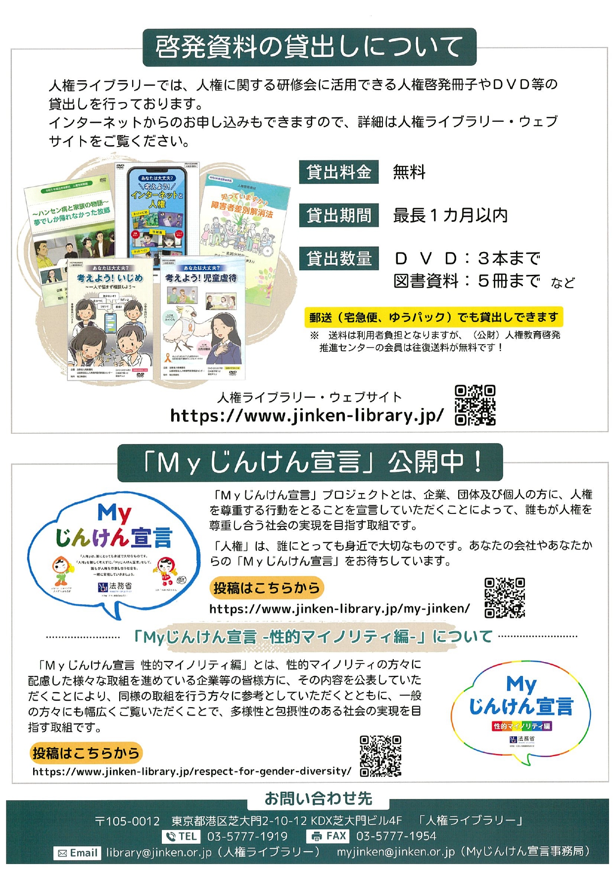 内容 (公財)人権教育啓発推進センターでは、法務省の委託を受けて制作した啓発資料を、送料含め無料で提供しています。ぜひ、お申込みください。