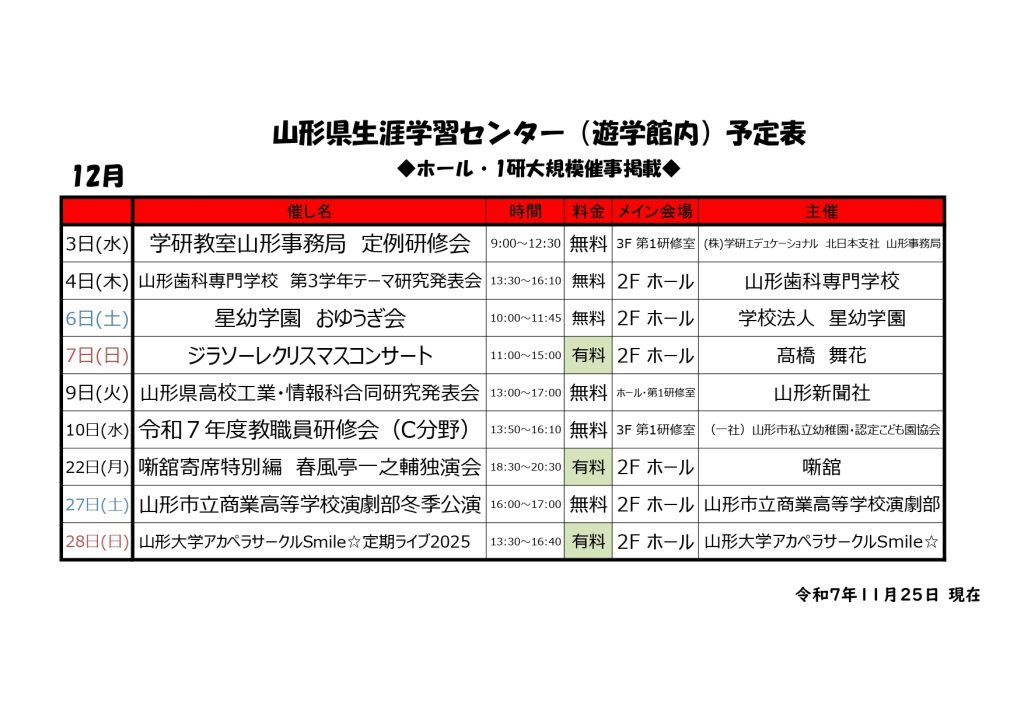 令和7年12月大規模催事(ホール・第1研修室)予定表