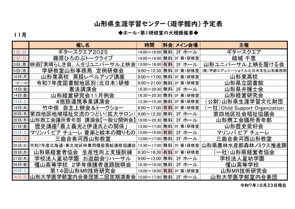 令和7年11月大規模催事(ホール・第1研修室)予定表