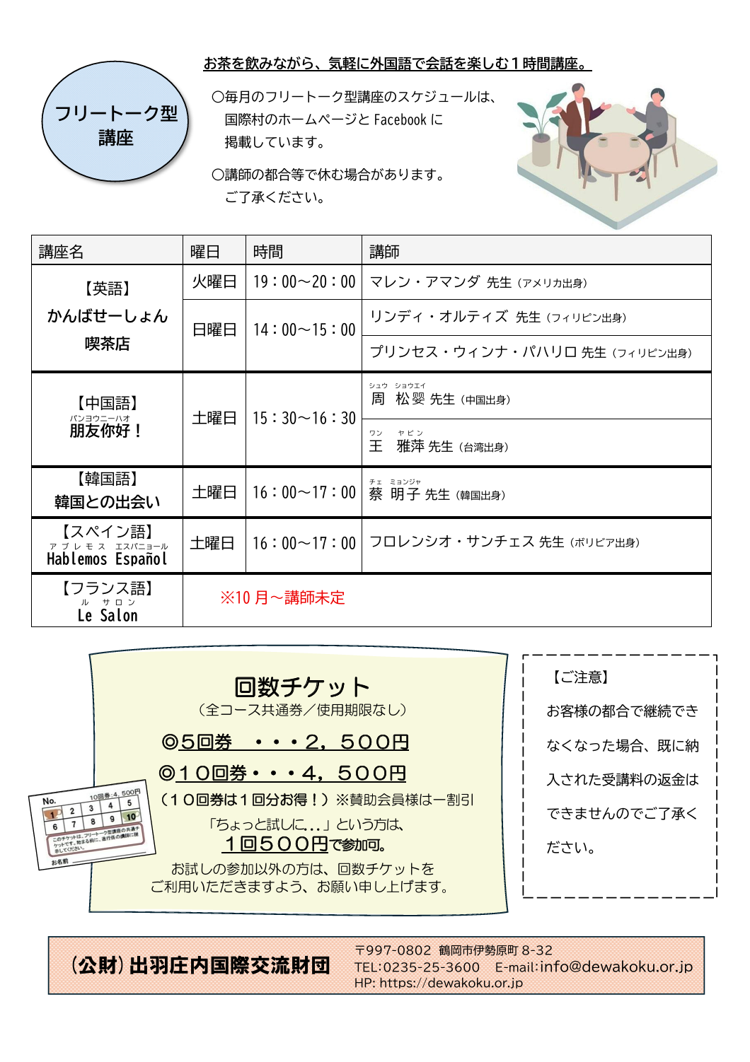 料金 | 有料:教室型:25,200円(テキスト代別)、フリートーク:回数チケット制 |