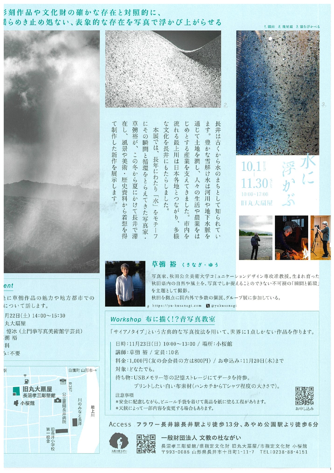 内容 | 長井は古くから水のまちとして知られています。豊かな雪解け水は河川や地下水脈を通じて土地を潤し、人々の生活や農業をはじめとする産業を支えてきました。市内を流れる最上川は日本各地とつながり、多様な文化を長井にもたらしました。 本展では、長年にわたり「水」をモチーフにその瞬間と循環をとらえてきた写真家・草彅裕が、この冬から夏にかけて長井で滞在し、風景や美術・歴史資料から着想を得て制作した新作を展示します。 |