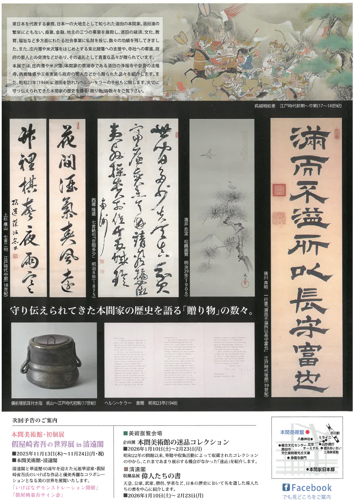 東日本を代表する豪商であり大地主として知られた酒田の本間家。東北諸藩や、寺社、政府への貢献で得た、貴重な返礼品を展示いたします。
