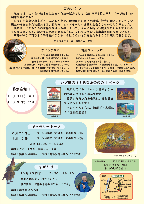 内容 | 庄内の絵本作家:さとうまりこ氏が絵を担当し、齋藤リュータロー氏が文章を考えて制作している1ページ絵本。1つ1つの作品に唯一無二の世界があり、登場人物も紡がれる物語も1つとして同じものはありません。 さとうまりこ氏の描く優しくあたたかくも小ネタ満載の絵。齋藤リュータロー氏の書くクスッと笑える文。コミカルで可愛らしく、独特の世界観を持つ「1ページ」の絵本、全57点をどうぞお楽しみください。 ※月曜日休館/月曜日祝日の場合は開館し、翌火曜日休館 <関連イベント> ①投票イベント【いざ選ぼう!あなたの心の1ページ】 内容:展示している57作品の中から、あなたのお気に入りの1ページ絵本を1つ選んで投票しよう!投票いただいた方には参加賞あり。さらに投票者の中から抽選で3名様にさとうまりこ氏手描きのミニ原画をプレゼントいたします。 費用:入館料のみ ②作家ギャラリートーク 日時:10月25日㊏/11月15日㊏ 両日ともに14:30~15:30 費用:入館料のみ 予約:電話受付(0234-62-2632) ③語り部ごんべぇの「すがたり」 日時:10月25日㊏ 13:30~14:10 費用:入館料のみ ④作家 在館日 日時:11月3日㈪㈷-終日/11月9日㈰-午後 ⑤ホットほっとコンサート 日時:11月24日㈪㈷ 14時~ 費用:入館料のみ |