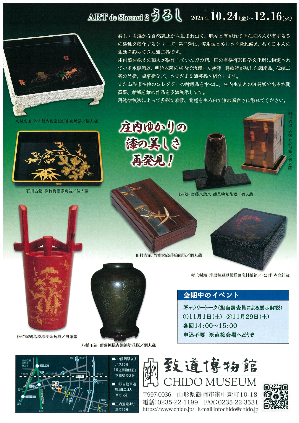 内容 | 厳しくも温かな自然風土から生まれ出て、脈々と繋がれてきた庄内人が有する 美の感性を紹介するシリーズ第2弾。古くから日本人の生活と深く結び付いてきた漆。江戸時代の庄内では、職人がお 椀や重箱といった日用品としての漆器を作り、藩お抱えの御職人は刀の鞘などの 制作に熱心に取り組みました。明治になると御職人だった阿部竹翁が竹塗を創始 し、蒔絵では本間蕣華などの優れた漆芸家を輩出しました。山形市在住の蒐集家 が所蔵する作品を中心に展観します。 美術的価値と「用の美」を併せ持つ漆芸品の魅力に触れてください。 ○ギャラリートーク 11月1日(土)、 11月29日(土) 各回14:00~15:00 |