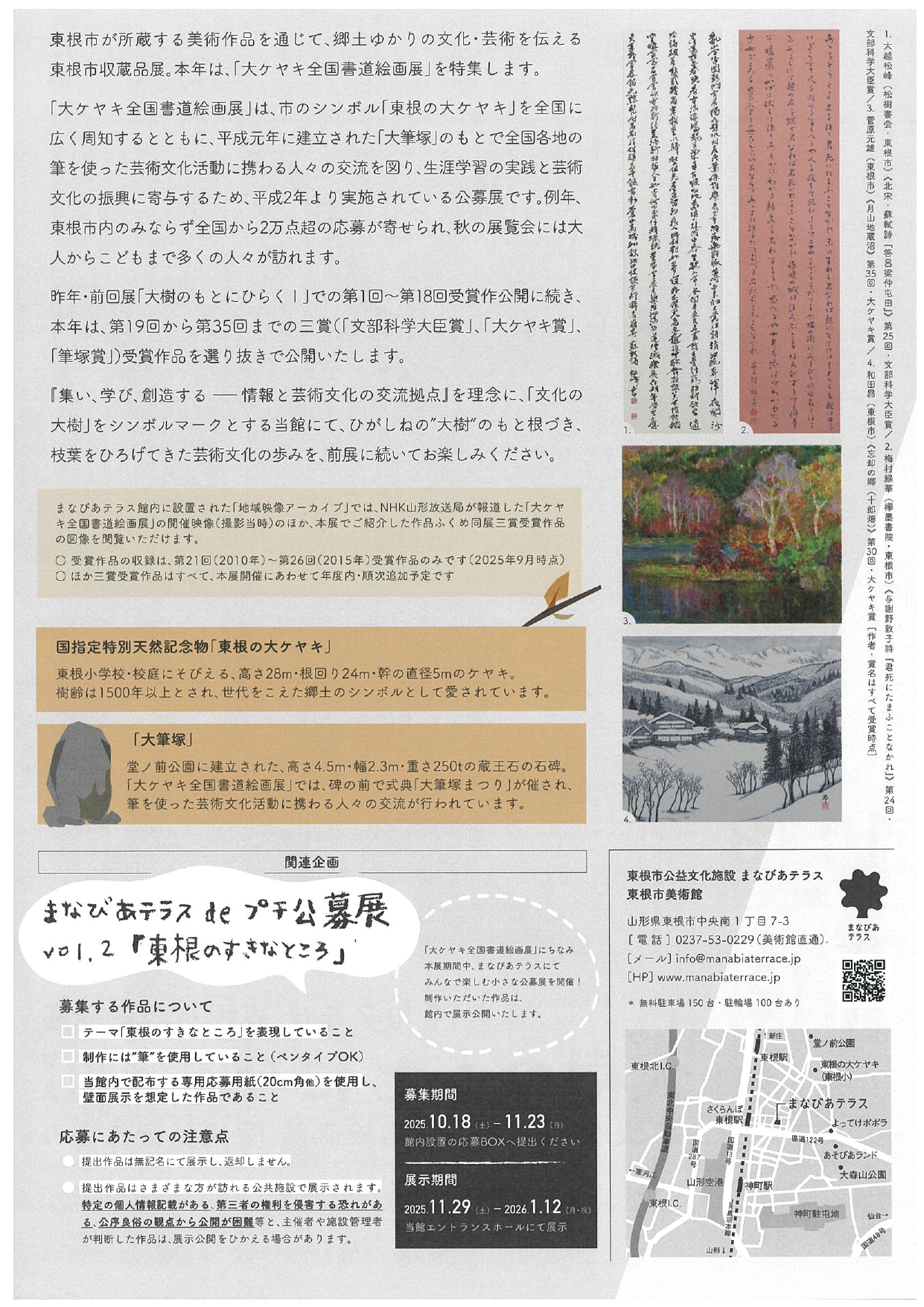 | 内容 | 東根市が所蔵する芸術作品を通じて、郷土ゆかりの文化や芸術の歩みを伝える東根市収蔵品展。本年は前年に続いて、「大ケヤキ全国書道絵画展」を特集します。 「大ケヤキ全国書道絵画展」は、市のシンボルでもある国指定特別天然記念物「東根の大ケヤキ」を全国に広く周知するとともに、平成元年(1989年)に市内・堂ノ前公園に建立された「大筆塚」のもとで、全国各地の筆を使った芸術文化活動に携わる人々の交流をはかり、生涯学習の実践と芸術文化の振興に寄与するために、平成2年(1990年)より実施されている公募展です。例年、東根市内のみならず県内外より20,000点を超える作品が寄せられ、10月中旬の展覧会では大人からこどもまで多くの人々が訪れます。 本展では、前展に続いて、大ケヤキ全国書道絵画展にて3賞(「文部科学大臣賞」*1、「大ケヤキ賞」、「筆塚賞」)を受賞した書道・絵画作品をそれぞれ選りすぐって展示公開いたします。『集い、学び、創造する―情報と芸術文化の交流拠点』を基本理念に、「文化の大樹」をシンボルとする当館・まなびあテラス。ひがしねの"大樹"のもと、年々根づき、枝葉をひろげてきた芸術文化活動の歩みをお楽しみください。 |