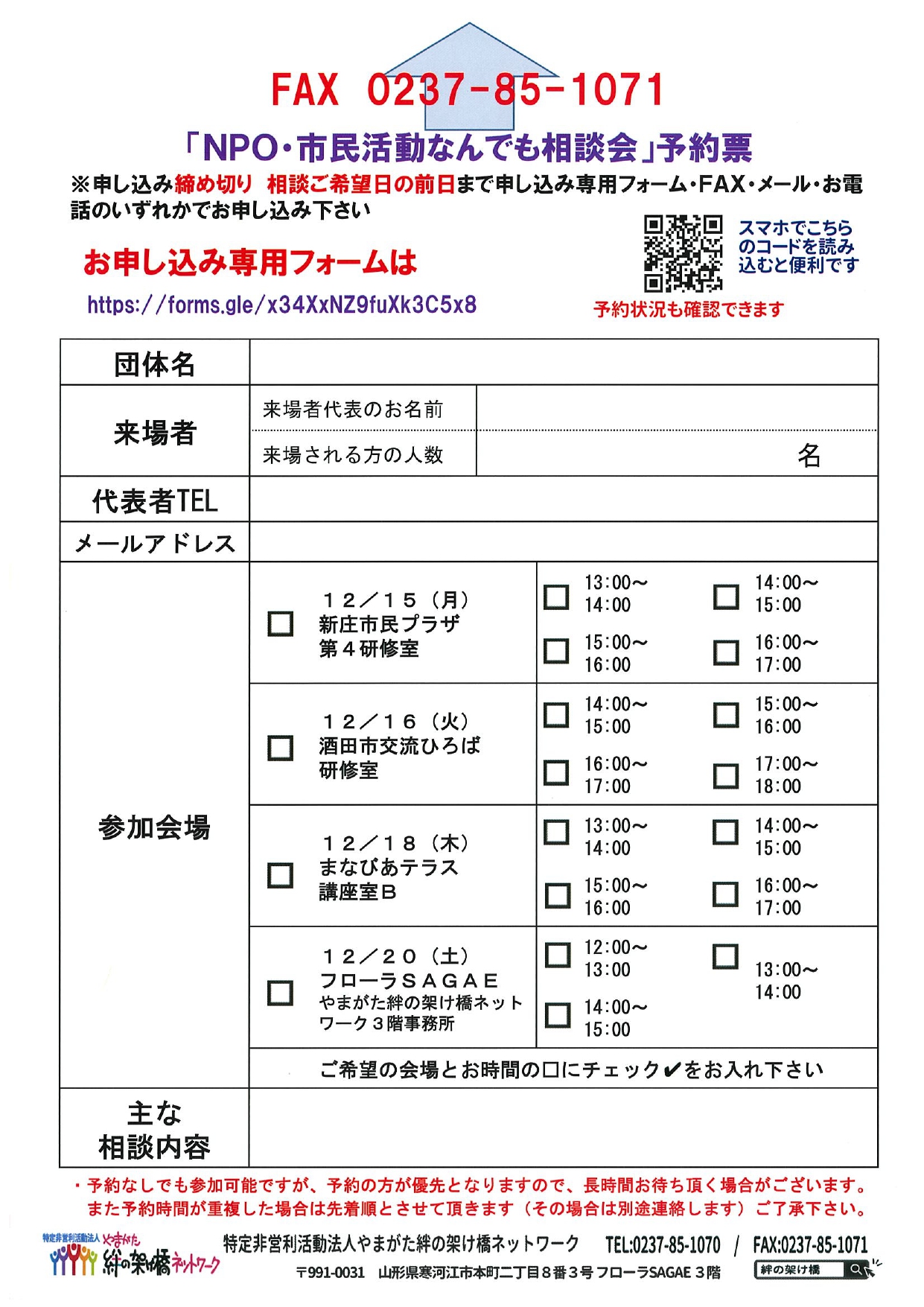 | 会場 | 酒田市交流ひろば研修室(酒田市中町3-4-5)、新庄市民プラザ第4研修室(新庄市大手町1-60)、まなびあテラス研修室B(東根市中央南1-7-3)、フローラSAGAEやまがた虹の架け橋ネットワーク3F事務所(寒河江市本町8-3) |