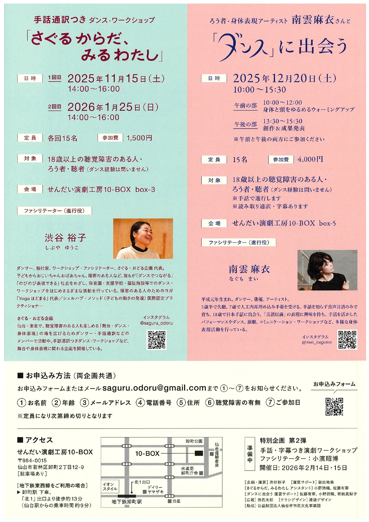 | 内容 | 手話通訳つきダンス・ワークショップ さぐるからだ みるわたし 11/15(土)14:00~16:00 2026/1/25(日)14:00~16:00 ろう者・身体表現アーティスト南雲麻衣さんと「ダンス」に出会う 12/20(土)10:00~15:30 |