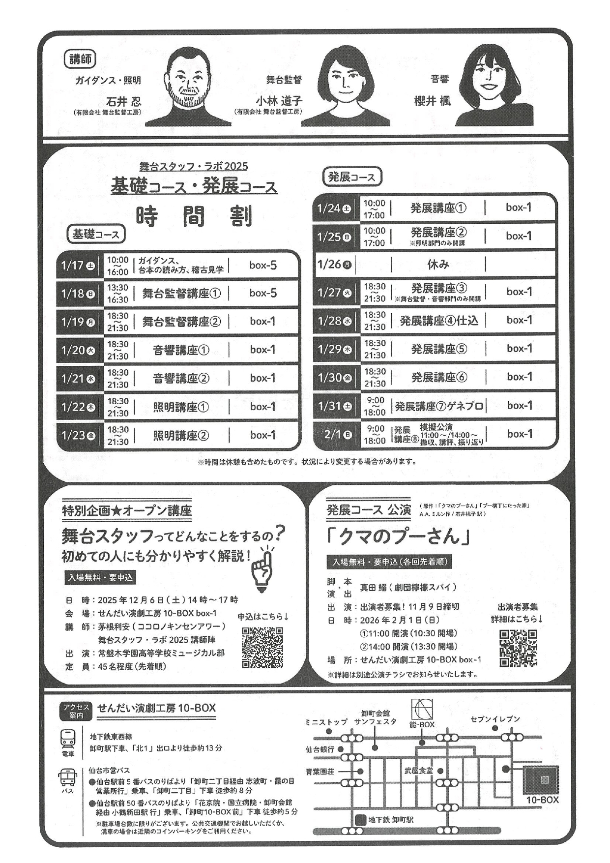 | 内容 | 舞台の「裏方」としての技術を学んでみたい、「裏方」として舞台を作ってみたい方。ぜひご参加ください! 最終日の模擬公演を目指して、基礎から学び実際のスタッフワークを体験します。舞台づくりの楽しさを、実感してください。 |