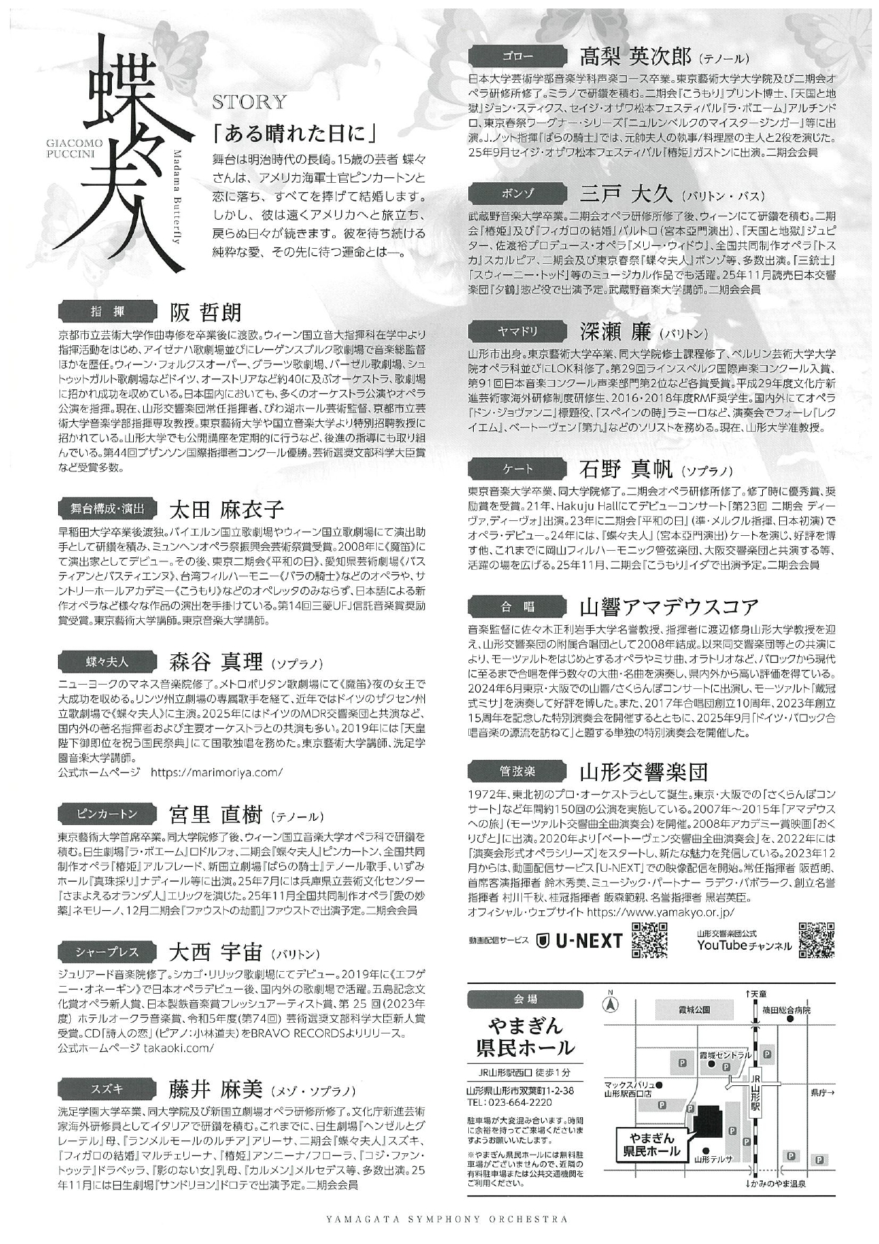 | 内容 | 指揮:阪 哲朗 舞台構成:演出:太田 麻衣子 蝶々夫人:森谷 真理 ピンカートン:宮里 直樹 シャープレス:大西 宇宙 スズキ:藤井 麻美 ゴロー:髙梨 英次郎 ボンゾ:三戸 大久 ヤマドリ:深瀬 廉 ケート:石野 真帆 合唱:山響アマデウスコア 山形県立山形東高等学校音楽部・吹奏楽部 山形県立山形西高等学校合唱団 山形県立山形北高等学校音楽科・音楽部 管弦楽:山形交響楽団 |