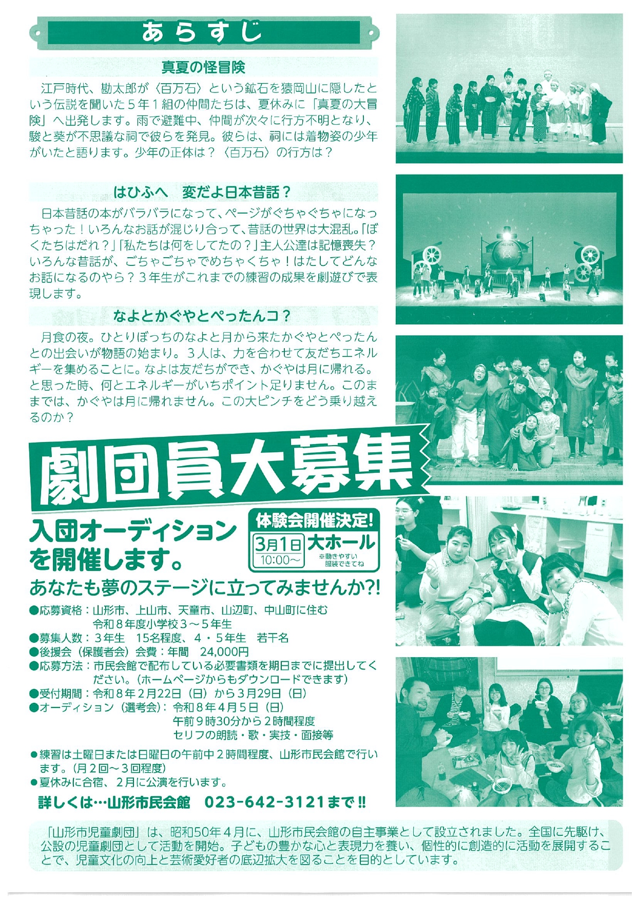 | 内容 | 1回目:開演10:00(開場9:30) 2回目:開演14:00(開場13:30) 「真夏の怪冒険」 作 佐藤美佐子 補作・演出 白鳥樹一郎 「はひふへ 変だよ日本昔話?」 作・演出 大沼篤 「なよとかぐやとぺったんコ?」 作 須藤翔平 演出 須藤正博 |