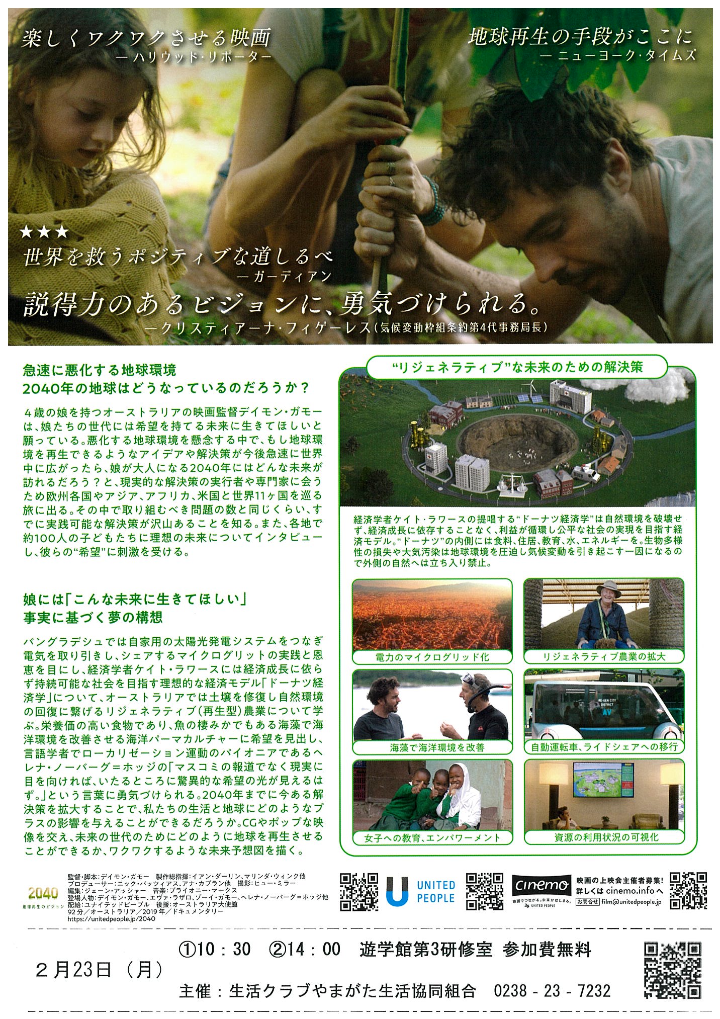 | 内容 | 問題の“解決策”に焦点を当てたリアルな未来創造型ドキュメンタリー 1回目10:30~ 2回目14:00~ |