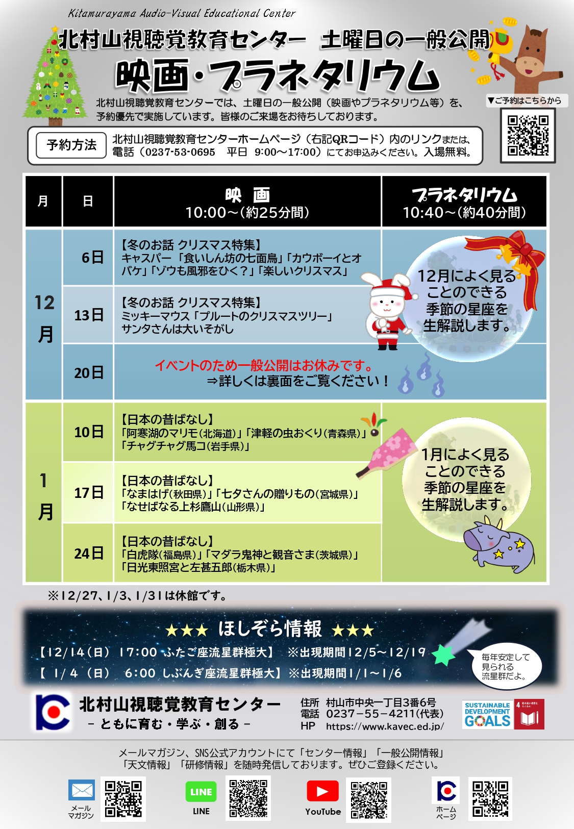 北村山視聴覚センター12月、1月土曜一般公開 映画・プラネタリウム&イベントのお知らせ