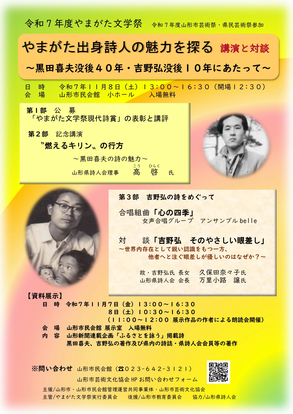 令和7年度やまがた文学祭 講演と対談「やまがた出身詩人の魅力を探る~黒田喜夫没40年・吉野弘没後10年にあたって~」